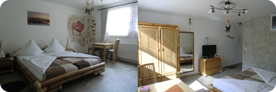 Viel Platz und eine gemütliche Sitzecke bietet unser großes (19,5 m²) und helles Gästezimmer. Ausgestattet mit einem komfortablen Bett und schönen Bambusmöbeln lädt es, dank ruhiger Lage, zum Entspannen ein. Höhlenwand, Tipi-Lampen und Traumfänger verleihen dem Zimmer einen besonderen Charme.